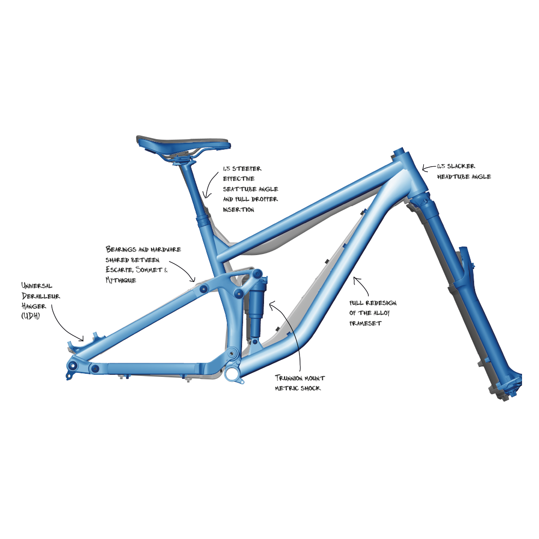 We don’t believe in reserving features for top-end models. In particular, when it comes to geometry – if it can benefit everyone’s riding, then it’s worth doing at every price point. Once more, we looked closely at the Sommet and Escarpe and tweaked the geometry accordingly so that the Mythique is much more responsive on the climbs. No more will you feel slouched and sluggish over the rear of the bike.