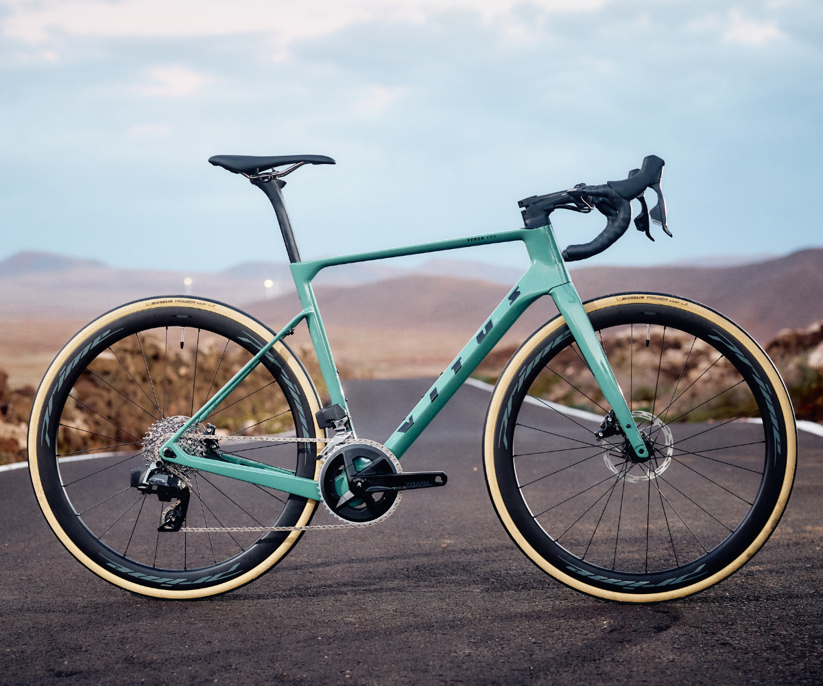 This Vitus Venon EVO-RS Rival AXS is built up with SRAM's 2x Rival AXS 12-speed electronic drivetrain. It uses an internally routed cockpit, custom headset and integrated fork for maximum efficiency and comes stock with Micheline Power Cup 700x28c tyres that roll fast and are a little wider for comfort and grip. The Venon EVO frame can accommodate up to 45mm tyres, but we've paid special attention to its rear end to ensure the bike's snappy race bike-like feel wasn't sacrificed in the name of clearance. In this particular build, the rear tyre clearance is limited to maximum 40mm due to the position of the front derailleur.